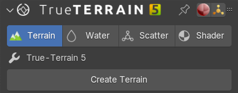 The N panel is where you will find all the (current) main functions of TrueTERRAIN 5.x. Across the top of the panel we have tabs for Terrain, Water, Scatter, and Shader. These tabs will be your main working spaces and will control functions respective to the system you're using. For example Terrain will only control the manipulation of the object/mesh that has been created.