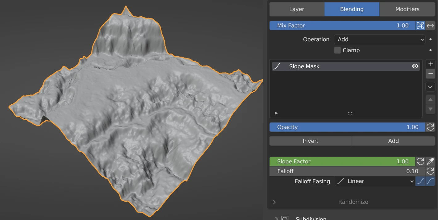 The extent of incline that is incorporated into the mask. A value of 0 signifies that no slope is included, encompassing areas that are flat and parallel to the ground. On the other hand, a value of 1 implies that slopes up to and including 90-degree cliffs are considered and included in the mask.
